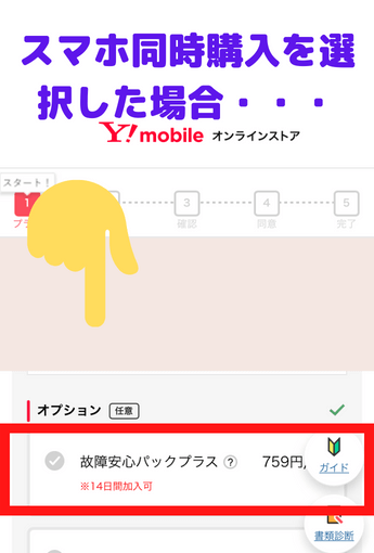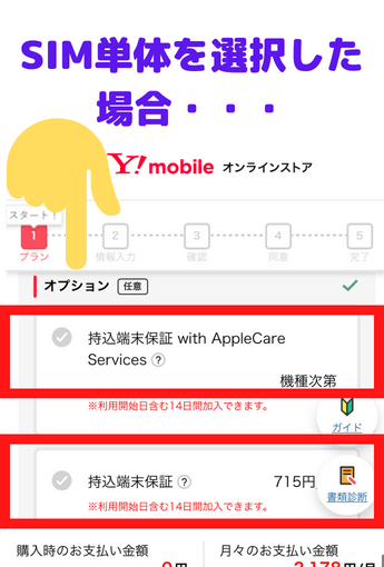ワイモバイル申込み時には、SIM単体申込みか端末同時購入かを初めに選択するのですが、下記画像のように選択内容に対応した端末保証サービスが表示されますよ💡