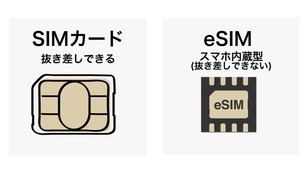 SIMは契約したプランで電話やネットをするために必要で、SIMカードは自分でスマホに抜き差しできるタイプ、eSIMはスマホ自体に内蔵されていて抜き差しができないタイプとなっています。